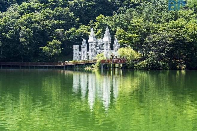 푸른 산을 배경으로 설치된 성과 탁 트인 저수지의 경관이 몽환적인 분위기를 자아낸다.