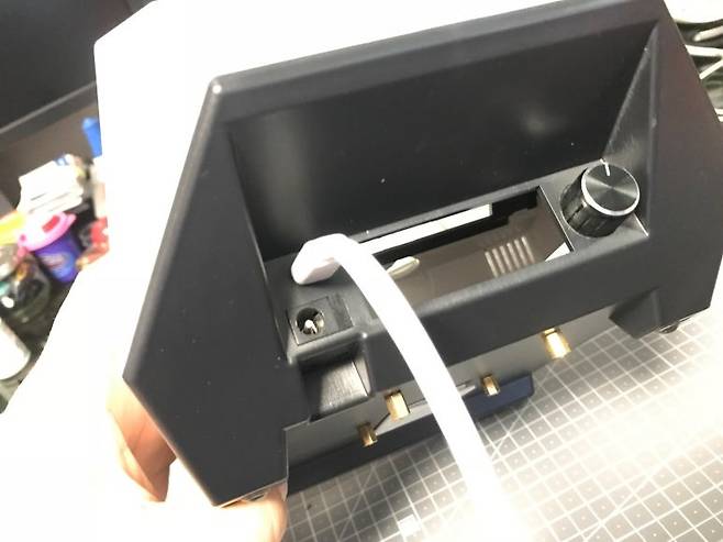 전원 입력 부 구성을 먼저 만들어 봅니다. 볼륨 조절 노브도 뒤쪽으로 위치시켰습니다.