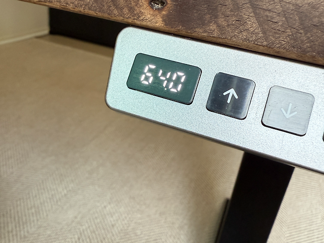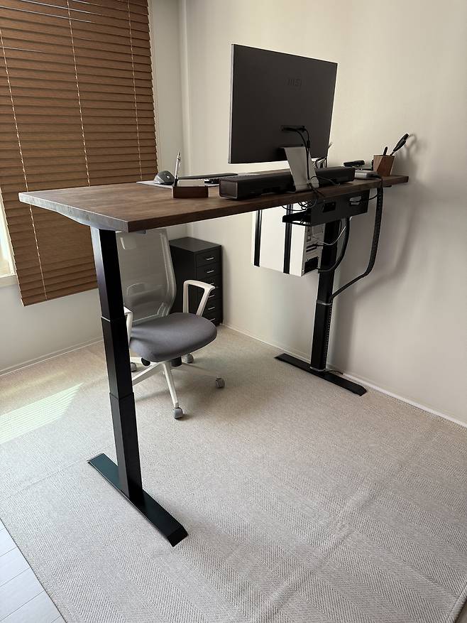 상판을 포함한 전체 책상 무게가 제법 나가는데도, 흔들림 없이 부드럽게 올라가고 내려옵니다.
