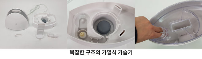 하지만 대부분 제품이 (1)비 개방형 수조 (2)분리형 기화부 (3)가습 가이드관 등 기타 세척부가 있어 초음파, 자연기화식 대비 세척 자체가 번거로운 단점이 있으며 제품에 따라 완벽한 세척이 불가능한 구조도 있을 수 있습니다.