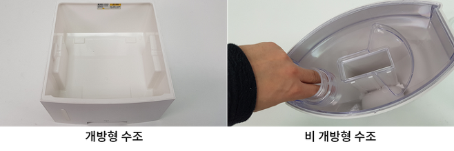 수조(=물통)는 위 사진 속 왼쪽에 위치한 개방형 구조가 세척이 편리합니다. 비 개방형 수조는 세척이 어려울 뿐만 아니라 구석구석 완벽한 세척이 불가능한 제품도 있습니다.