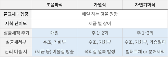 살균효과로 오염이 비교적 덜하지만 관리 미흡 시 석회질(물속의 미네랄 성분)과 물때가 누적되면 완벽히 제거되지 않을 수 있어, 위생상 좋지 않기 때문에 다른 방식과 마찬가지로 권장되는 수준의 세척관리는 필요합니다.