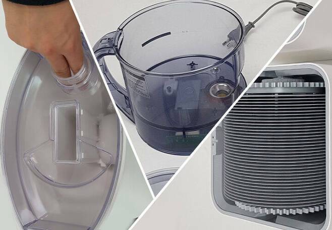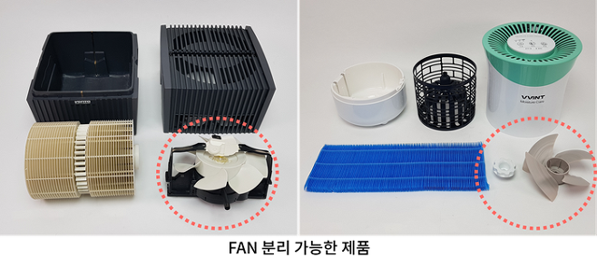 또한 자연기화식 가습기는 바람을 일으키는 FAN이 있어 먼지가 쌓이게 되면 필요시에 먼지를 제거해야 하며, 위와 같이 FAN이 쉽게 분리되는 제품이 (어려운 제품 대비) 좀 더 편리하게 관리 가능합니다.