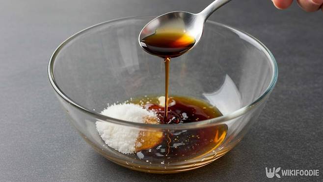 6. 간장 1큰술, 미림 1큰술, 설탕 1작은술, 물 1큰술을 끓여 소스를 만든다.