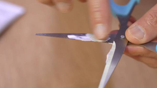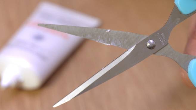 가위 날이 날카롭기 때문에 손으로 닦기엔 조금 위험할 수 있어요. 그럴 땐! 바로 선크림을 활용하면 되는데요.