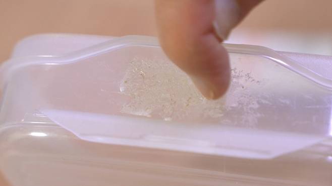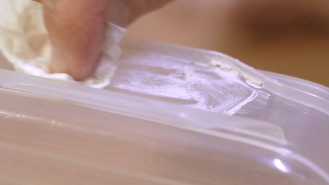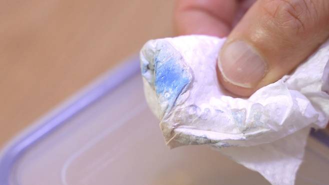이후 키친타월을 이용해 선크림을 닦아내기만 하세요. 이렇게 하면 끈끈이가 녹아 손쉽게 제거가 가능해요.