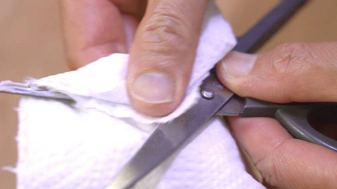 선크림 적당량을 가위 날에 조심히 발라 주세요. 그리고 가위질 몇 번 해 놓으세요. 그러면 선크림이 골고루 묻게 된답니다.