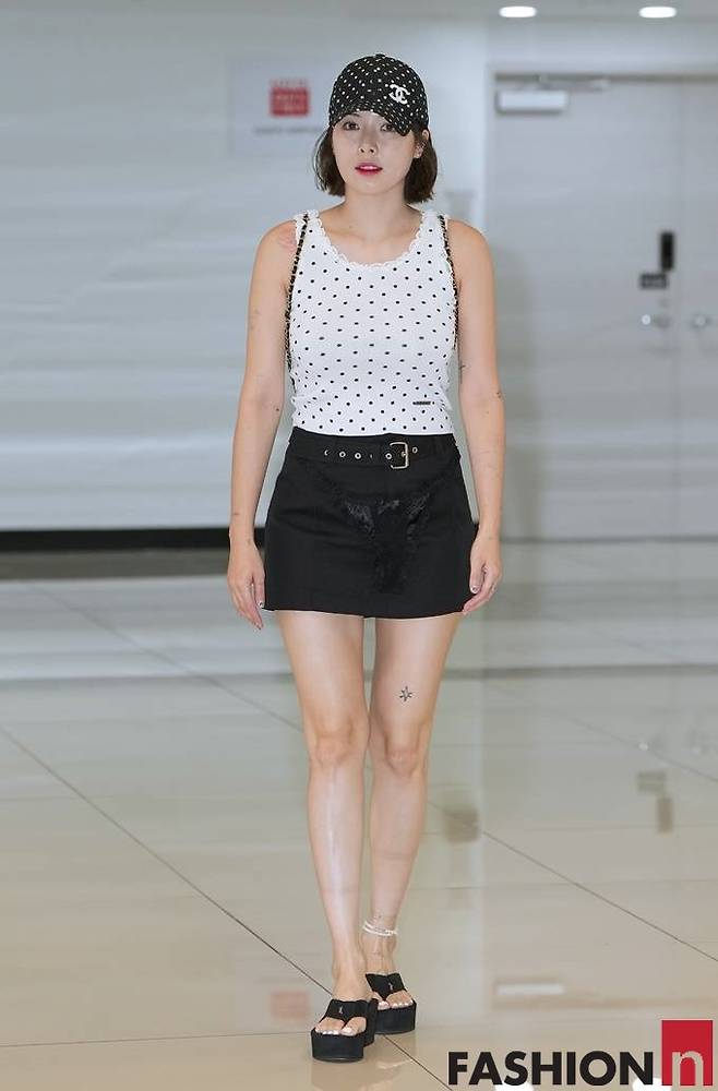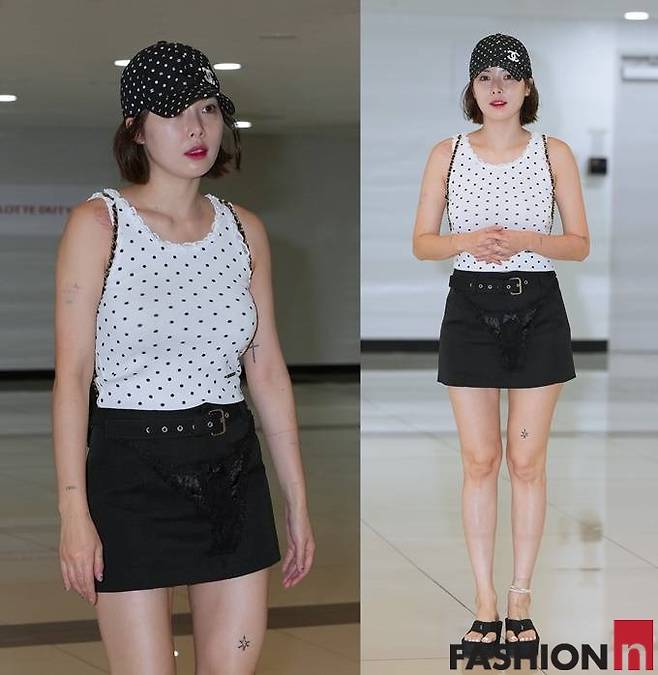 이날 현아는 도트 무늬 민소매 탑과 미니 스커트, 여기에 도트 무늬 볼캡으로 센스있는 공항패션을 연출했다.