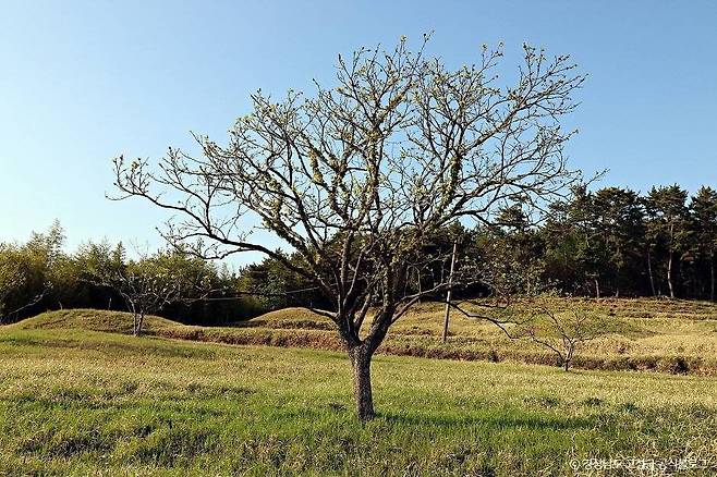 나지막한 언덕 위, 풀숲 사이로 조용히 모습을 드러낸 고성 내산리 고분군은 약 100여 기의 무덤이 있었다고 전해진 가야무덤입니다. 현재는 반 정도 남아 있으며 무덤의 내부는 구덩이식 돌널무덤(수혈식 석곽묘)으로 가야지역의 일반적 형식을 따르고 있어요.