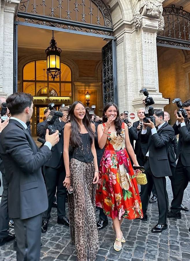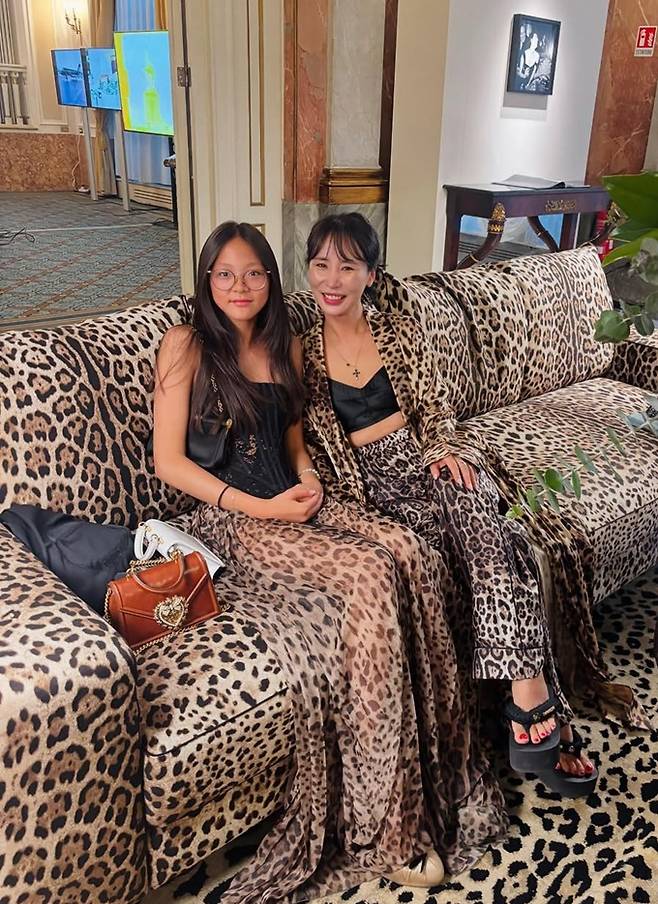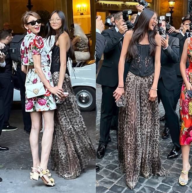 공개된 사진과 영상에서 추사랑은 레오파드 롱 원피스와 코르셋 슬리브리스 블랙 톱을 걸친 드레스룩으로 엄마를 따라잡은 늘씬한 기럭지를 과시했다.
