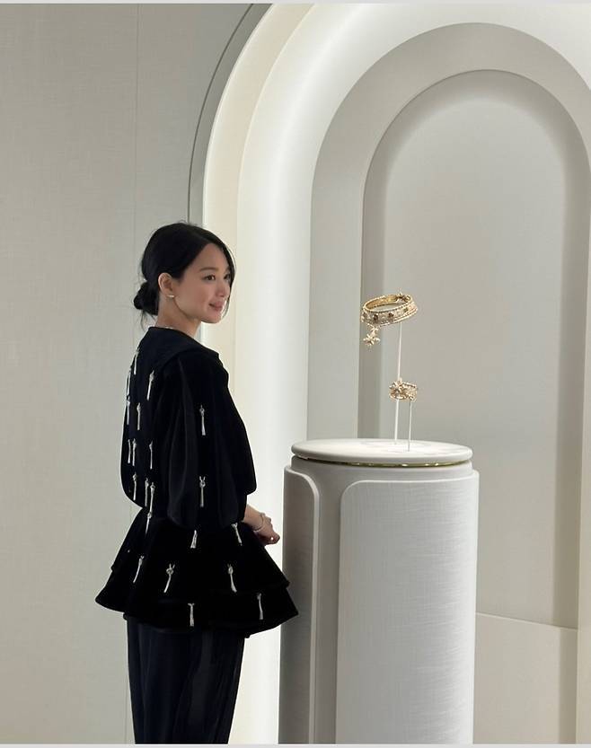 진주 귀걸이와 미니멀한 업스타일 헤어는 군더더기 없이 절제된 고급미를 보여줬고, 주얼리 박람회장을 거닐며 선보인 이 룩은 공간의 격조까지 끌어올리는 분위기를 자아냈습니다.