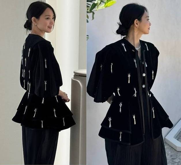 재킷에는 리듬감 있게 배열된 자수 모티브와 테슬 장식이 더해져 움직일 때마다 섬세한 디테일이 살아났고, 퍼프소매와 허리선이 강조된 실루엣이 신민아 특유의 여리하면서도 단정한 아우라를 배가시켰습니다.