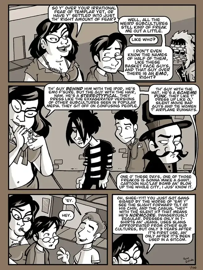최근의 패션 트렌드 맥락을 파악하기 위해서는 ‘놈코어’부터 이해할 필요가 있다. 이 용어는 2008년 라이언 에스트라다(Ryan Estrada)의 <Templar, Arizona>라는 웹툰의 사사로운 대사로 등장했다. 놈코어라는 단어는 패션과는 아무 관계 없이, 요즘 세상이 온갖 멍청한 서브컬쳐(Sub-culture)로 가득하다는 비아냥 섞인 대사에서 작가가 생각할 수 있는 가장 이상하고 멍청한 패션 장르를 상상하면서 만든 단어로 사용되었다고 인터뷰에서 밝힌 바 있다.