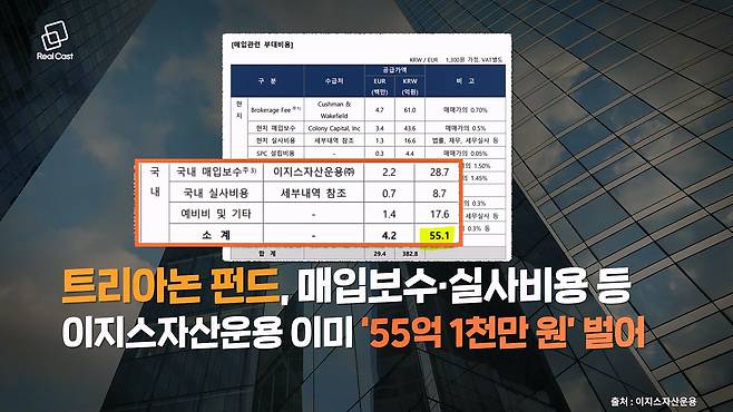 실제로 트리아논 펀드의 경우 이지스자산운용은 매입보수와 실사비용 등을 포함해 55억 1천만 원을 시작과 동시에 가져갔습니다.