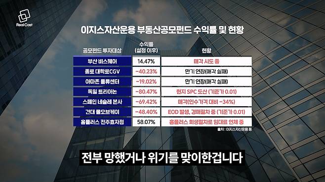 이 분야 국내 원탑이라고 불리던 이지스자산운용의 7개 부동산공모펀드가 전부 망했거나, 위기를 맞이한겁니다.
