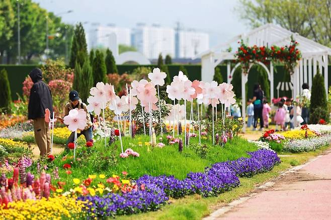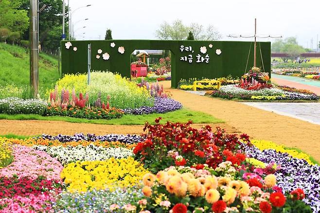화순군은 꽃강길 상상정원과 음악분수 주변을 중심으로, 다채로운 봄꽃 조형물과 토피어리, 그리고 다양한 초화류를 정성껏 꾸며 방문객을 맞이하고 있다.