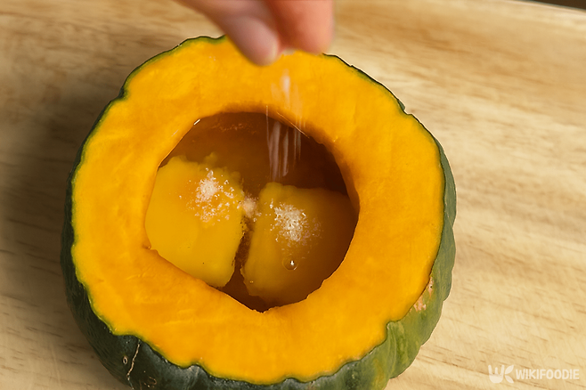 조리 전에 단호박 속에 버터를 한 조각 넣으면 향이 훨씬 진해진다. 완성 후 꿀을 살짝 뿌리면 단호박의 단맛이 더 살아난다. 파슬리 가루를 뿌리면 보기에도 좋고 향도 더 풍부하다.