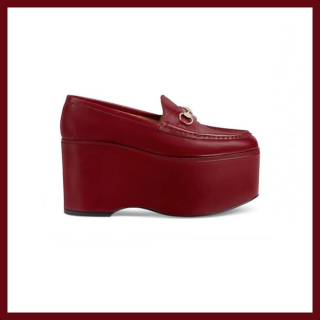 높고 두툼한 플랫폼이 묵직한 존재감을 자랑하는 구찌의 홀스빗 플랫폼 로퍼 버건디 버전을 추천합니다. 발등을 덮는 기장의 팬츠보다는 미디스커트와 매치했을 때 더욱 빛을 발합니다. 거기에 키치한 양말을 더한다면 누구보다 센스 있는 스타일링을 완성할 수 있습니다.