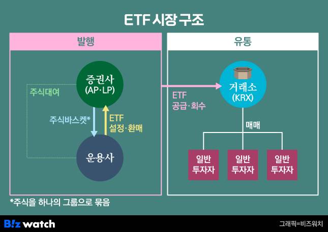 예를 들어 한 운용사가 'KRX 2차전지 지수'를 추종하는 ETF를 만든다면, 지정참가회사(AP)로 선정된 증권사는 운용사가 정한 포트폴리오(PDF)에 따라 주식 바스켓(묶음)을 만든다. 운용사는 AP로부터 넘겨받은 주식 바스켓으로 ETF를 만들어 AP에 발행해준다.