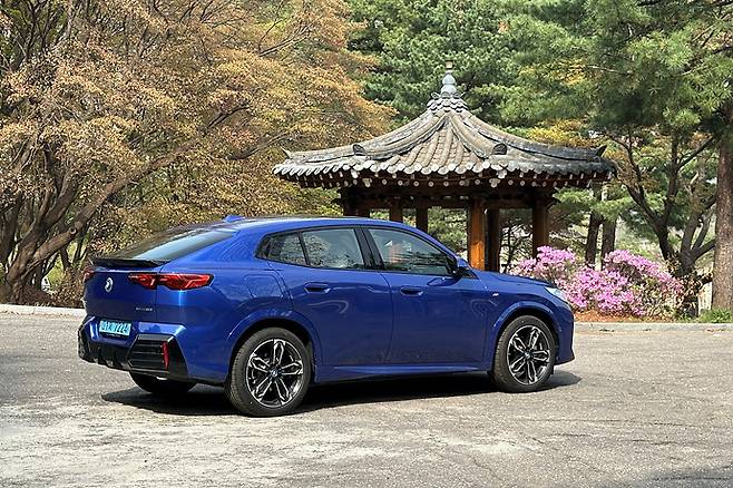 신형 iX2는 단번에 시선을 끌 만큼 스타일리시하다. 쿠페형 SUV를 연상시키는 루프라인, 존재감을 더하는 대형 키드니 그릴과 액티브 셔터, 그리고 두툼한 리어 범퍼와 스포일러까지 외관의 디테일은 단순히 ‘소형 SUV’라 부르기엔 아쉬울 정도다. 전면부 헤드램프에는 파란색 디테일이 더해져 전기차임을 강조하며, 날렵한 인상을 완성한다. 전반적인 차체 비율과 디테일은 마치 iX의 축소판을 연상케 하며, 실제 크기보다 더 커 보이는 시각적 효과도 준다.