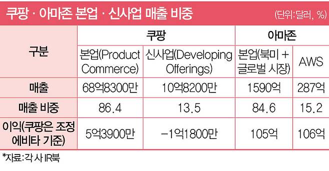 아마존과 쿠팡의 실적엔 비슷한 부분이 많다. 대표적인 게 본업과 신사업 매출 비중이다. 양 사 모두 큰 틀에서 8 대 2 매출 비중을 보인다. 아마존은 지난해 4분기 매출 1877억달러를 냈다. 북미 매출(1155억달러)과 북미 제외 글로벌 매출(434억달러), AWS 매출(287억달러)로 구성됐다. 매출 비중을 환산하면 이커머스 기반의 북미·글로벌 시장 본업 매출이 84.6%이고 AWS 신사업 매출이 15.2%다. 쿠팡의 본업과 신사업 간 매출 비중도 크게 다르지 않다. 지난해 4분기 쿠팡 실적 자료에 따르면 본업(Product Commerce) 매출 비중은 86.4%, 신사업(Developing Offerings) 매출 비중은 13.5%다.