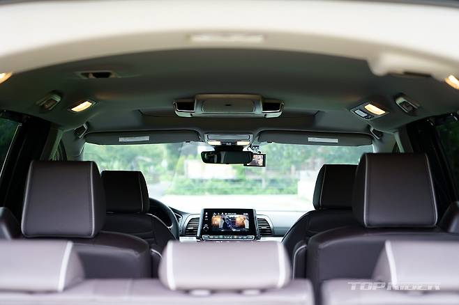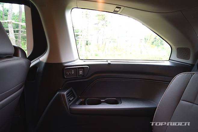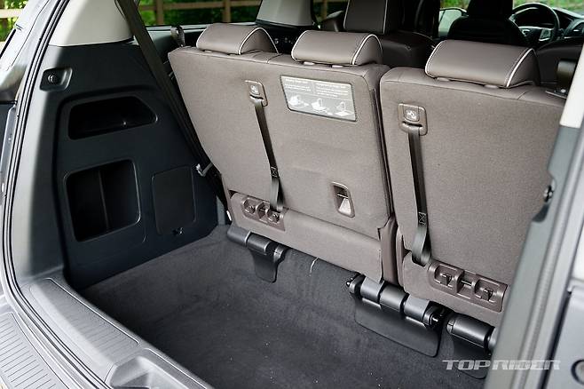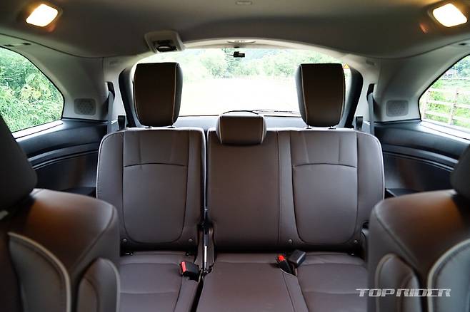 특히 마음에 드는 부분은 3열 공간으로, 실외에서 보이는 슬라이딩 도어 이후부터 아래로 내려가는 독특한 그린하우스 디자인은 3열 탑승자의 답답함을 해소시키기 위한 기능적인 디자인이다. 별도의 에어벤트와 컵홀더는 물론 선쉐이드와 캐빈워치, 캐빈토크가 지원된다.