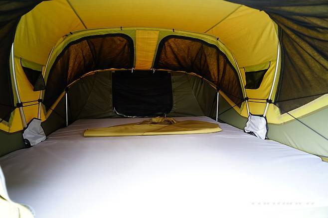 루프탑 텐트 설치는 지퍼를 열어 외부 커버를 벗겨내고, 사다리를 길게 뺀 다음 반대쪽으로 넘겨 지렛대처럼 사다리를 아래로 누르면 텐트가 펼쳐지는 구조다. 루프탑 상단이 바닥면으로 이어져 접은 상태에서의 예상보다 넓은 공간을 확보했다. 바닥 매트가 기본 사양이다.