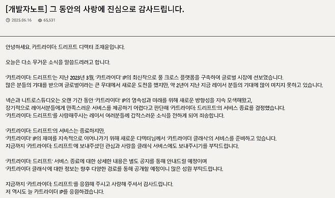 16일 게임 홈페이지 공지를 통해 조재윤 디렉터는 "글로벌이라는 큰 무대에서 새로운 도전을 했지만 약 2년이 지난 지금 레이서 분들의 기대에 많이 미치지 못하고 있다"며 "넥슨과 니트로스튜디오는 오랜 기간 동안 '카트라이더' IP의 영속성과 미래를 위해 새로운 방향성을 지속 모색해왔고, 장기적으로 만족스러운 서비스를 제공하기 어렵다고 판단해 서비스 종료를 결정했다"고 밝혔다.