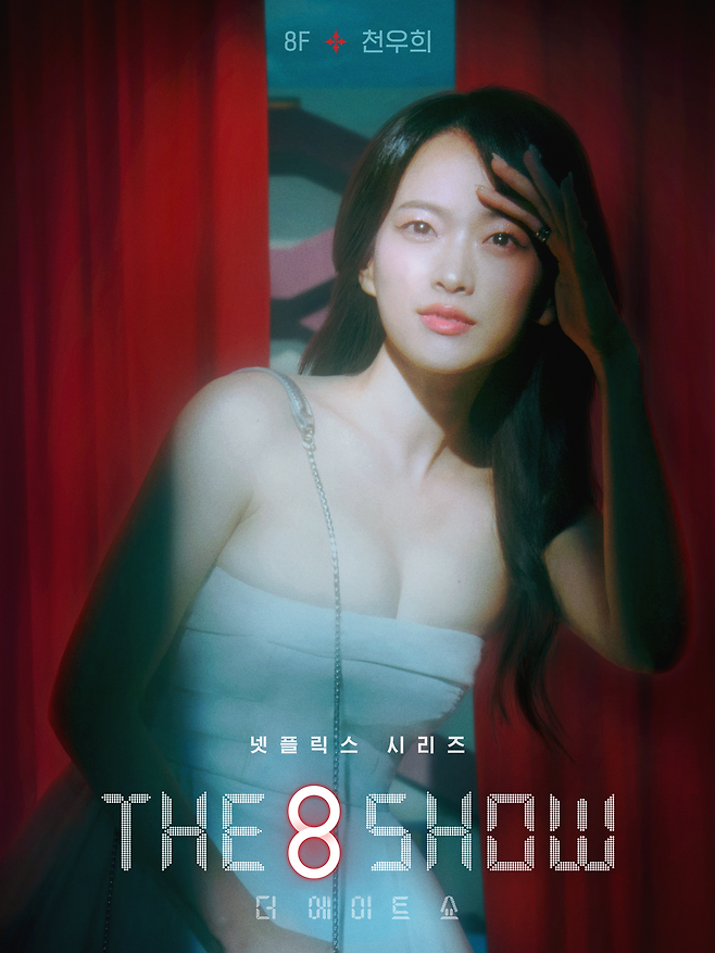 '더 에이트 쇼' 천우희는 극 중 어디로 튈지 모르는 자유분방한 성격의 8층으로 분한다. 돈도 돈이지만 흥미에 이끌려 쇼에 참여하게 된 8층은 파격적인 행동과 비주얼로 극의 긴장과 재미를 이끄는 인물이다.