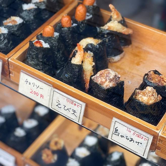 바로 옆에 있는 오니기리 모가미라는 곳에서 에비 오니기리도 샀습니다.