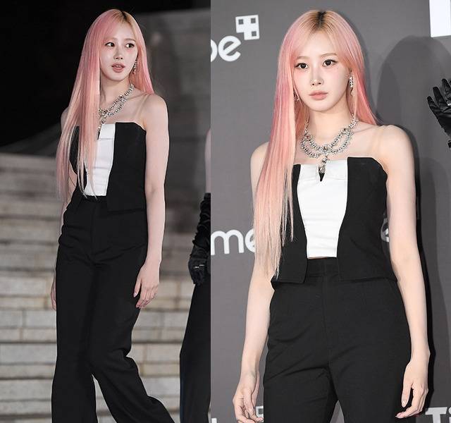 특히, 눈길을 사로잡는 핑크 블론드 헤어는 화사하면서도 개성을 드러내어 전체적인 룩에 생기를 더했습니다.