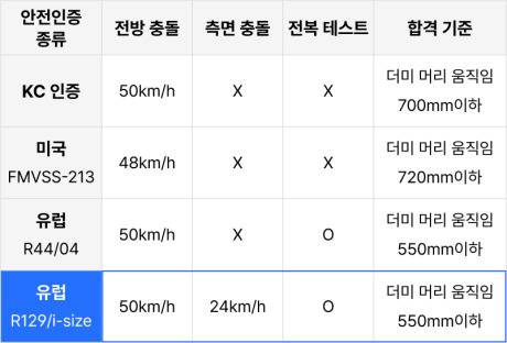 인증별로 안전성을 확인하기 위한 테스트의 방법과 기준에 차이가 있는데, i-size 인증이라고 불리는 유럽의 R129의 기준이 가장 까다롭다고 볼 수 있습니다.