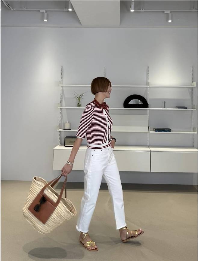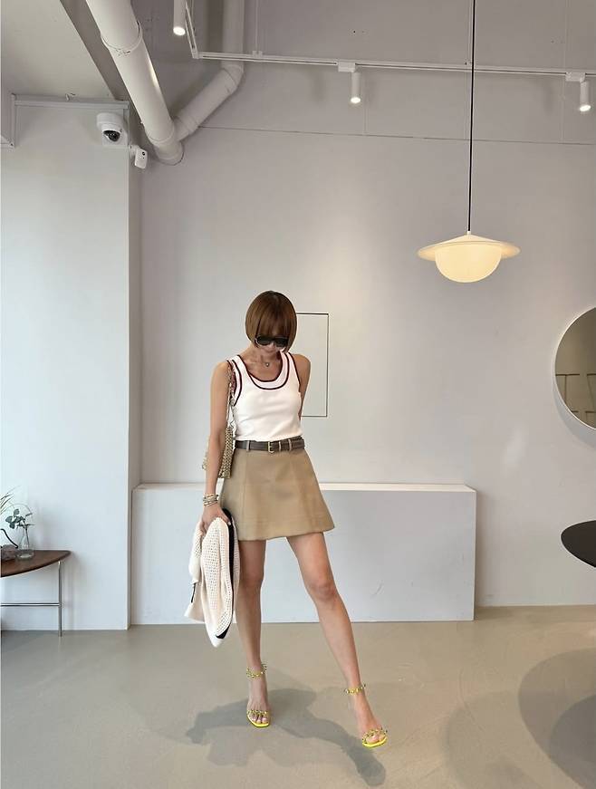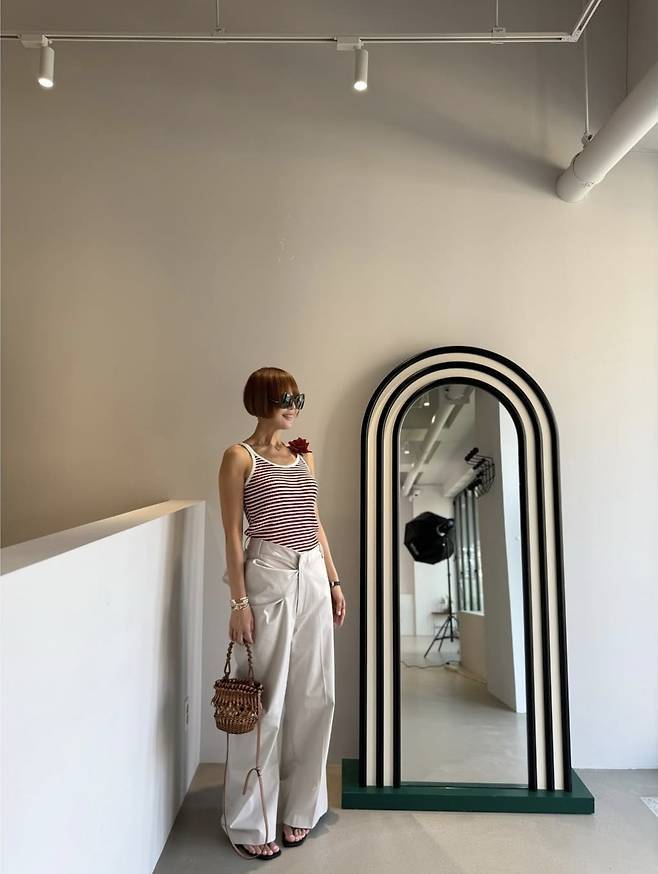 배색 포인트가 들어간 민소매 톱에 베이지 미니스커트를 매치해 슬림한 라인을 드러냈으며, 여기에 블랙 벨트와 옐로우 스트랩 샌들로 경쾌한 분위기를 더했습니다.또 다른 착장에서는 스트라이프 슬리브리스 톱에 와이드한 실루엣의 하이웨이스트 팬츠를 매치해 한층 모던한 무드를 연출했습니다.특히 자유로운 분위기의 라탄백과 플라워 브로치 장식은 디테일을 놓치지 않는 센스있는 포인트가 되어 완성도를 높였습니다.전체적으로 최은경만의 시크하고 우아한 여름 데일리룩이 돋보인 착장이었습니다.