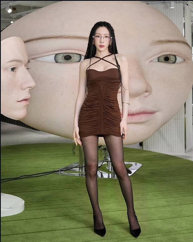 태연은 크로스 스트랩 디테일이 돋보이는 브라운 셔링 미니드레스에 시스루 블랙 타이츠와 스틸레토 힐을 매치해 극강의 세련미를 연출했습니다.