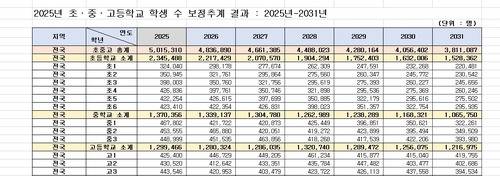 연합뉴스 보도에 따르면 한국교육개발원 교육기본통계, 국가데이터처 장래인구 추계, 행정안전부 주민등록인구통계 등을 토대로 학생 수를 예측한 통계다.