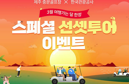 제주 중문골프장에서는 여행 가는 달을 맞이해 '3월' 한 달 동안 매주 월요일마다 특별한 장소에서 일몰을 경험할 수 있는 이벤트를 준비하고, 사연과 함께 신청을 받고 있습니다. 1차 투어 신청은 2월 20일 ~ 2월 27일까지이고, 2차 투어 신청은 3월 4일 ~ 3월 11일까지입니다. 따뜻해진 봄날, 일몰이 잘 보이는 중문골프장(15홀 티)의 잔디 위에서 맨발로 걸으며 일몰도 보고 퍼팅 체험까지 해볼 수 있는 특별한 경험을 꼭 놓치지 않기를 바랍니다.
