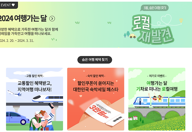 경기가 어렵다고 하지만 연휴가 시작되면 해외로 나가는 공항에 사람들이 북적거립니다. 반면에 국내 숨은 로컬여행지는 그만큼 여행객들의 발길이 닿지 않고 있습니다. 국내 여행을 준비했거나 해당 지역을 방문하려고 했다면, 정부에서 국내 여행 산업을 회복을 위해 진행하는 여행 가는 달 이벤트인 숙박, 교통, 놀거리 혜택을 활용하시면 도움이 될 것 같습니다