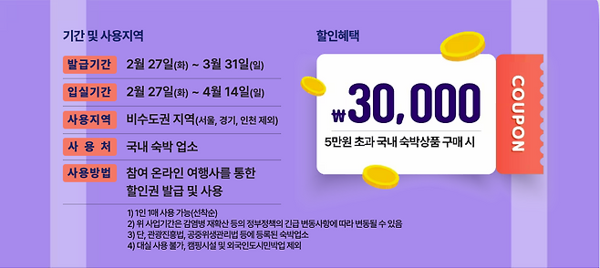 온라인으로 5만 원 초과 숙박 상품 예약 시 3만 원 쿠폰을 제공받아 할인을 받을 수 있습니다. 서울, 경기, 인천을 제외한 비수도권 지역의 숙박시설을 이용할 때만 혜택을 받을 수 있습니다. 쿠폰 발급 기간은 2월 27일 ~ 3월 31일까지이고, 입실은 4월 14일까지입니다.