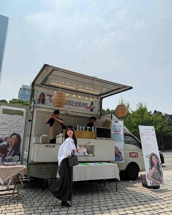 커피차 앞에서 포착된 모습에서는 클래식한 화이트 셔츠로 깔끔한 스타일링을 선보이고 있다. 오버사이즈 핏의 셔츠가 여유로운 실루엣을 만들어내며, 블랙 팬츠와의 조합으로 모노톤 코디를 완성했다. 야외 활동에 적합한 실용적이면서도 단정한 룩을 연출하고 있다.