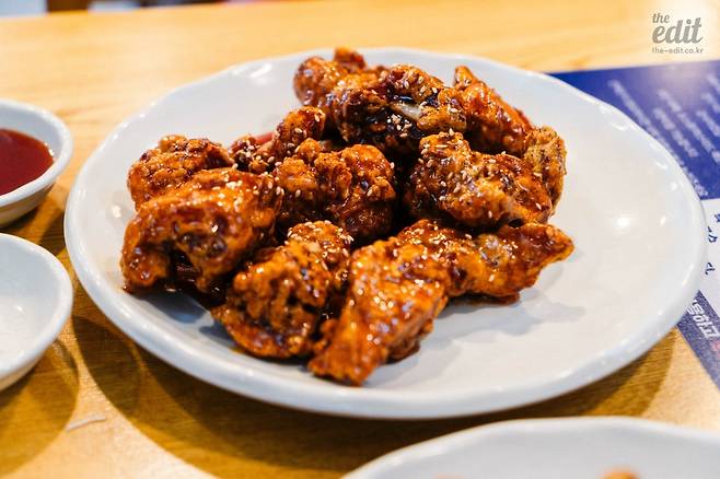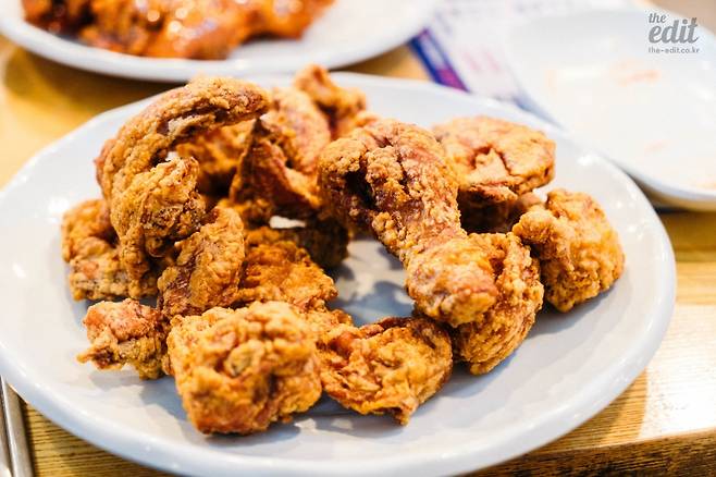 주말에는 삼시세끼를 치킨으로 먹을 정도로 많은 치킨을 먹어봤다. 하지만 이건 또 새롭다. 단맛도 짠맛도 매콤한 맛도 생각보다 약하다. 솔직히 처음에는 그 맛이 마냥 긍정적이진 않았다. 하지만 갓 튀겨 모락모락 김이 나고, 튀김옷이 바삭한 통닭이 맛이 없기는 힘들다. 평양냉면처럼 첫 입에는 갸우뚱하게 되지만, 묘한 중독성에 계속 손이 간다. 양념의 끈적이는 점성은 치킨보다는 닭강정을 떠올리게 한다. “니 내일 일 간다 안 캤나?” “됐다, 내 오늘 좀 달릴란다. 이모, 여기 생맥 두 잔이요.” 투박한 맥주잔과 부산 사투리가 사정없이 부딪치는 희망통닭은 오늘 소개할 어떤 곳보다 강한 부산성을 느낄 수 있는 곳이다. 한쪽벽에 설치된 TV, 롯데 자이언츠의 경기, 그리고 생맥 한 잔, 뭐가 더 필요할까.