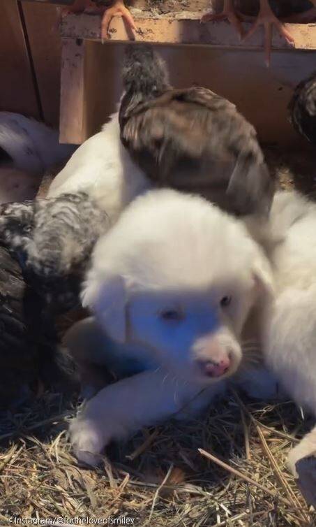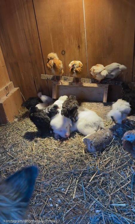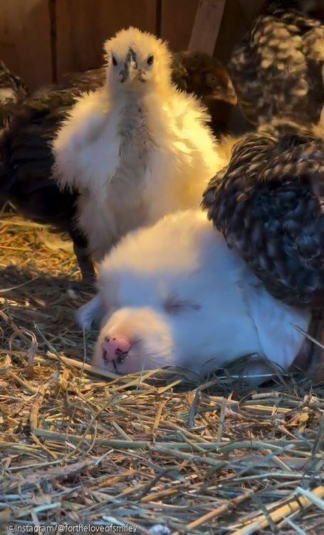 인스타그램의 한 유저(@fortheloveofsmiley)가 지난 13일 공개한 영상은 닭들이 있는 곳에서 낮잠을 자는 셰어를 보여줍니다.