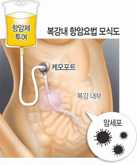 이에 복강 내에 직접 항암제를 주입해 치료하는 ‘복강 내 항암요법’이 고안됐다. 배에 작은 구멍(항암 포트)을 뚫고 3~4주마다 한번씩 복강 안에 항암제를 투입하는 방법이다. 서구에서는 대장·난소암 등에서 수십 년 전부터 시행돼 왔다.