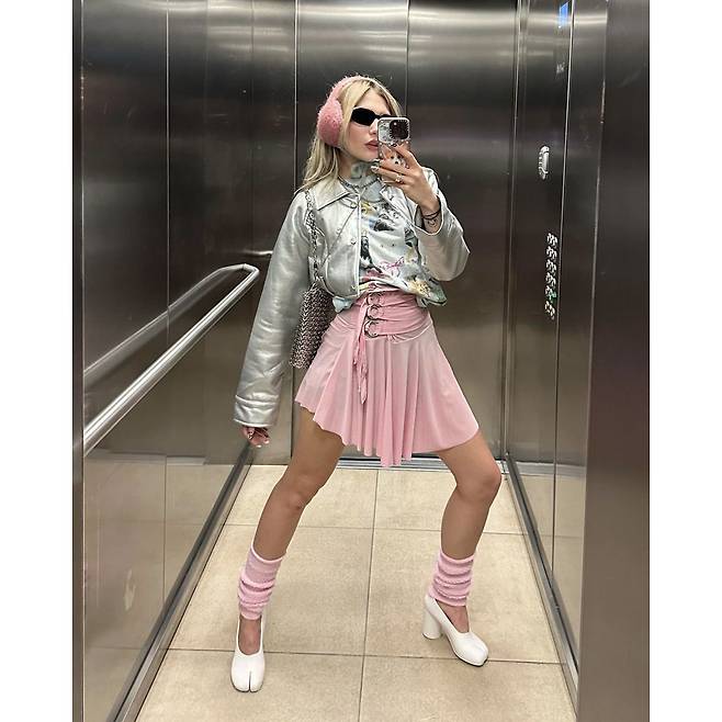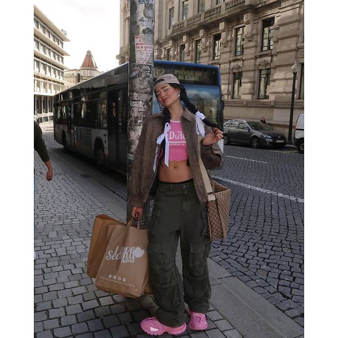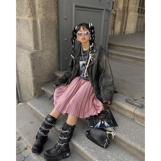 이네스 실바는 핑크의 다양한 캐릭터성을 자신만의 감성으로 자유롭게 표출한다. 카우보이 해트와 빈티지한 브라운 레더 벨트, 컷아웃 니팅의 크롭트 톱으로 웨스턴 룩을 연출하는가 하면, 블랙 컬러의 청키 체인 부츠, 크랙 라이더 재킷에 페미닌한 핑크 플리츠 스커트를 매치해 펑크 룩을 언밸런스하면서도 사랑스럽게 소화했다. 이때, 트렌디한 리본 디테일을 놓치지 않은 섬세함이 포인트. 그녀는 과감한 ‘깔맞춤’도 두려워하지 않는다. 또렷한 원색의 핑크 컬러를 위아래로 사용하며 시각적인 컬러 포인트를 극적으로 활용한다. 러블리한 요소를 더한 스트리트 룩과 페미닌한 배색 니트 원피스 룩이 대표적인 예다. 망설임 없는 그녀의 컬러 플레이에는 핑크의 미학이 오롯하게 돋보인다.