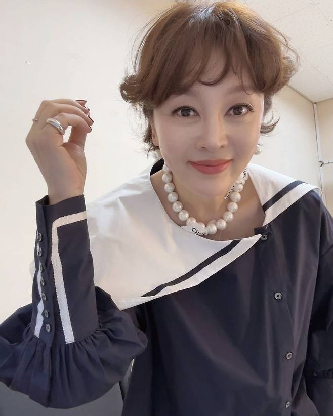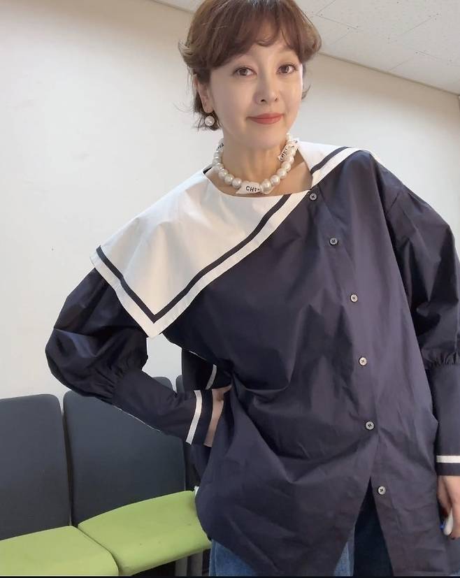 이승연은 네이비와 화이트 배색이 돋보이는 빅 칼라 블라우스를 착용해 세련되면서도 사랑스러운 무드를 연출했고, 커다란 진주 목걸이로 클래식한 포인트를 줬습니다.