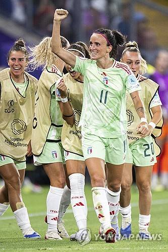 epa12254050 Italy's Barbara Bonansea, center, celebrates their goal to make it 0:1 with her teammates during the UEFA Women's EURO 2025 semi final soccer match between England and Italy in Geneva, Switzerland, 22 July 2025. EPA/JEAN-CHRISTOPHE BOTT