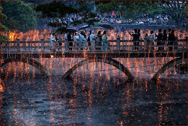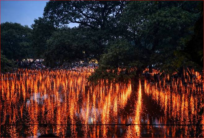 점화 후 약 2시간 동안 천천히 타들어 가는 낙화봉은 바람이 불 때마다 불꽃 송이를 연못 위로 흩뿌리며, 물 위에 비친 반영(리플렉션)과 어우러져 한 폭의 수묵화 같은 장관을 연출합니다. 나쁜 기운을 쫓고 복을 비는 선조들의 마음이 붉은 불꽃 비가 되어 2026년의 밤하늘을 수놓습니다.