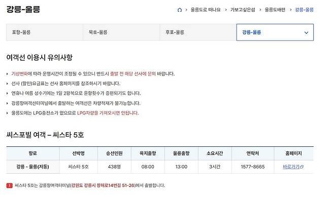 (※출처: 울릉군 울릉도 배편 홈페이지, 기상 상황에 따라 운행 시간 바뀔 수 있음)