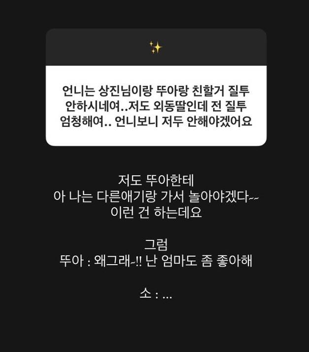 ํ ํฌ์ด โ์ธ๋๋ ์์ง๋์ด๋ ๋์๋ ์นํ ๊ฑฐ ์งํฌ ์ ํ์๋ค์?โ๋ผ๊ณ ๋๊ธ์ ๋จ๊ธฐ์, ๊น์์์ โ์ ๋ ๋์ํํ ๋ค๋ฅธ ์ ๊ธฐ๋ ๊ฐ์ ๋์์ผ๊ฒ ๋ค ์ด๋ฐ ๊ฑด ํด์. ๊ทธ๋ผ ๋์๊ฐ โ์ ๊ทธ๋~ ๋๋ ์๋ง๋ ์ข ์ข์ํดโ ์ด๋์โ ๋ผ๋ฉฐ ์ผ์ค ์๊ฒ ๋๋ตํ์ด์ ๐ ์ญ์ ์ผ์ค์๋ ์๋ง๋ต์ฃ ?
