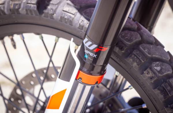 서스펜션 구성품으로는 압축 및 리바운드 조절(30클릭) 기능이 있는 43mm WP 에이펙스 포크가 23cm의 트래블을 제공한다. 타이어는 오프로드에 적합한 앞 21인치, 뒤 18인치 휠이 장착됐다.