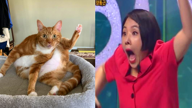 특히 이 사진은 일본에서 재물을 부르는 인형 '마네키네코'를 닮았다는 평과 함께, 한국 누리꾼들 사이에서는 예능 프로그램 '복면가왕'에서 코미디언 신봉선이 정체를 알고 깜짝 놀랐던 유명한 '상상도 못한 정체' 짤과 똑같다는 반응이 쏟아져 큰 웃음을 안겼다.